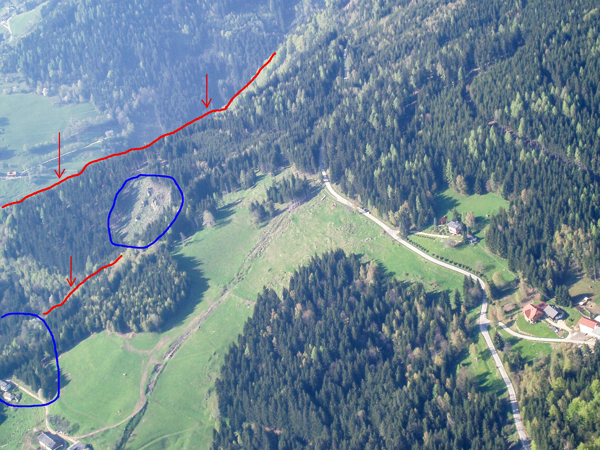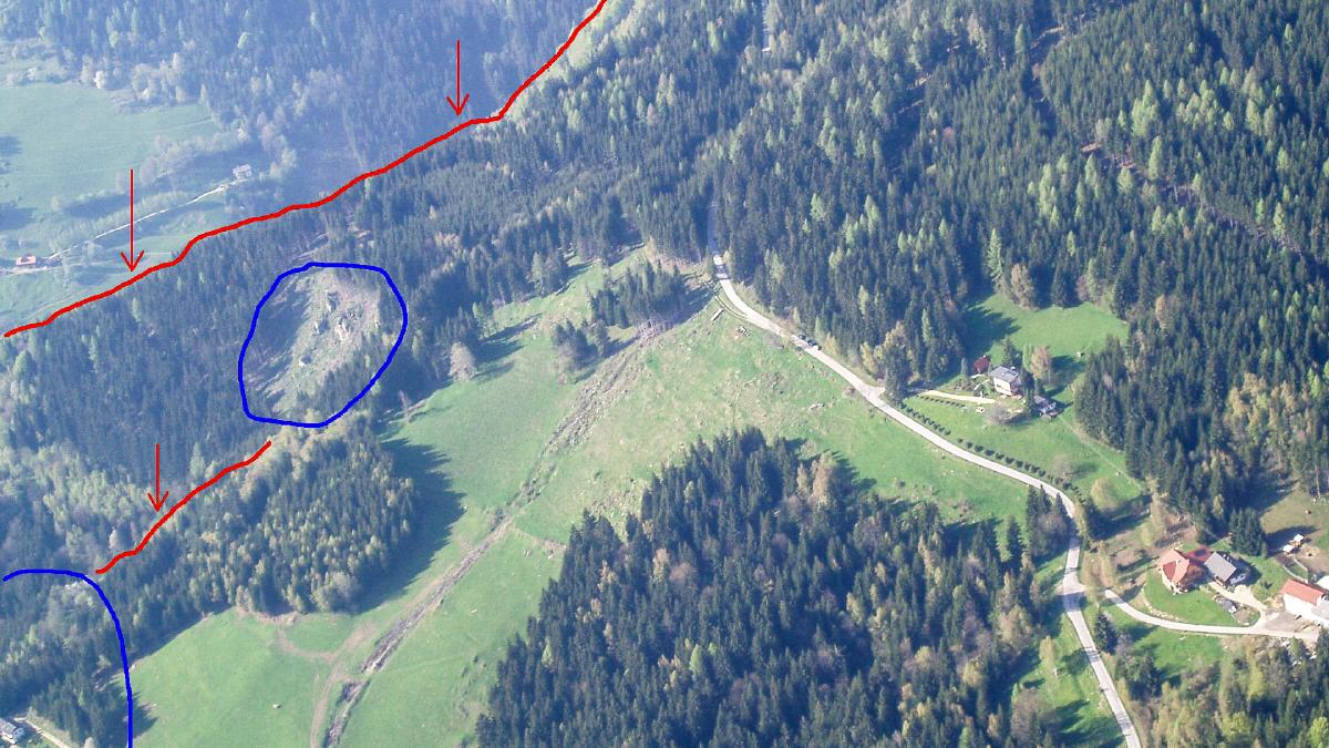 Die blau eingekreisten Bereiche zeigen die Stellen, wo immer Thermik zu finden ist. Wobei zu erwähnen wäre, dass im Bereich des Kahlschlages, bei richtiger Sonneneinstrahlung mit „Hammerablösen“ zu rechnen ist. Gleitschirmneulinge könnten mit der Situation unter Umständen überfordert sein, da es schon knapp über Grund losgeht und in Grundnähe eng zu zentrieren ist.